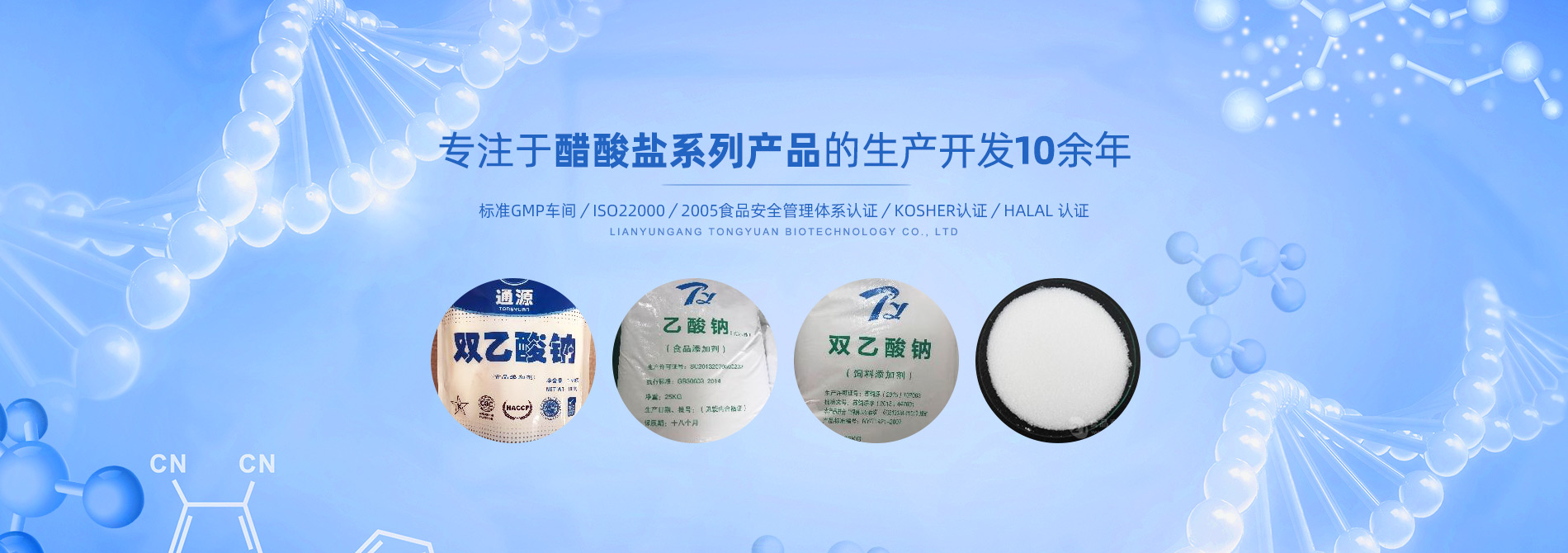 連云港市通源生物科技有限公司 是生產雙乙酸鈉、無水醋酸鈉、三水醋酸鈉、醋酸鉀、乙酸鈉、丙酸鈉、丙酸鈣和氯化鉀等系類醋酸鹽產品的專業制造商。公司專注于醋酸鹽系列產品的生產開發10余年,是國內專業醋酸酸鹽產品生產基地?! ∧壳埃覀円押腿?0多個國家和地區建立長期的業務合作關系,是中國較大的雙乙酸鈉生產商和出口商之一。作為中國食品添加劑和配料協會理事單位,通源公司已建成標準GMP車間5000余平方米,通過了ISO22000:2005食品安全管理體系認證、KOSHER認證、HALAL 認證等,這些都是我們提供高質量產品和優良服務的前提和確保?! ∩a出色產品,提供優良服務,滿足顧客需要,是我們努力的目標。愿和我們的朋友們攜手,共...